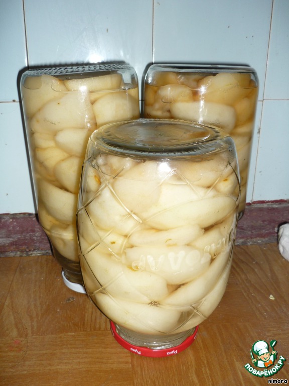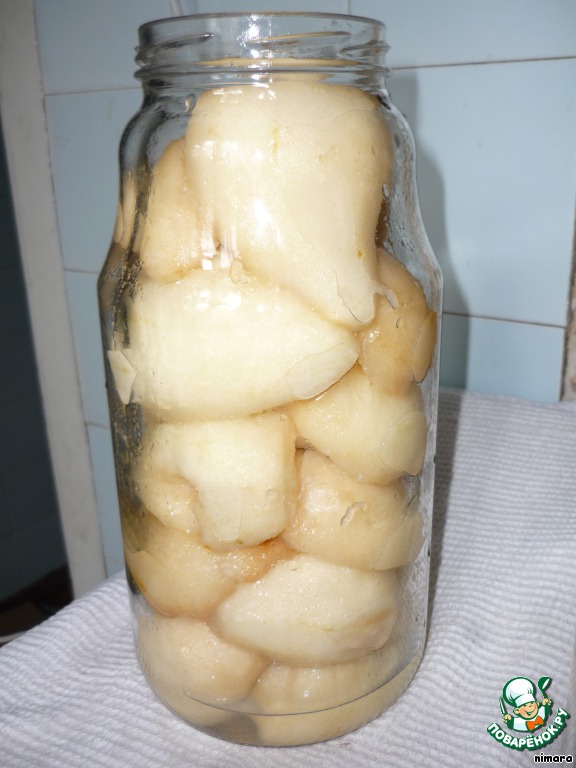 Груши выложить в стерилизованные банки срезом вниз, положить корочку лимона - 3-4см. Можно до самого горлышка, можно до середины банки. Залить сиропом банки -