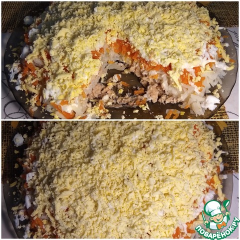 Все слои ещё раз через сетку майонеза ,сверху желтки ,сетка,лук ,укроп.