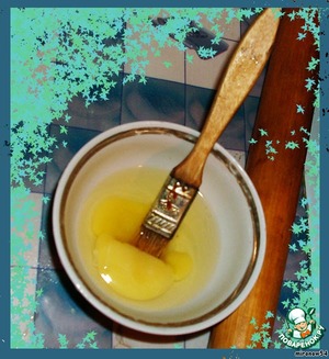 Застилаем раскатанным пластом теста днище и бока, промазанной растительным маслом глубокой сковороды, или формы с высотой борта 5-6 см.