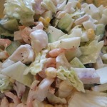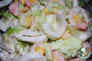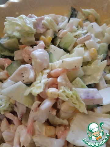 креветки + кальмары + огурцы + кукуруза + майонез + листья салата (можно кит. капусту).