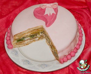 Дальше приступаем к украшению. Мастику из маршмеллоу я приготовила заранее (делала в первый раз :) ). Из раскатанного листа мастики сделала "покрывало" для торта. Ну и вылепила сердечко и шарики :) По правде говоря, мастика у меня получилась не очень : (, видимо много сахарной пудры туда насыпала, поэтому она вышла рассыпчатая. Буду еще пробовать :)