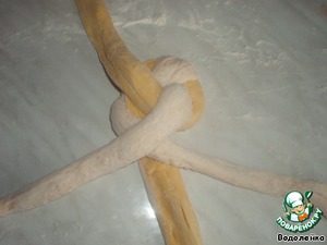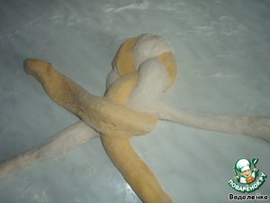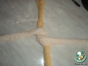 Теперь берем и раскатываем каждый кусочек в длинные "колбаски". И кладем крест на крест.
