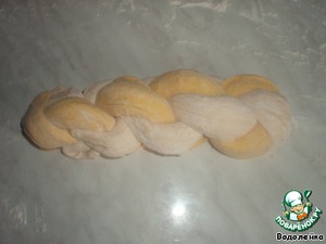 Итак, первым делом замешиваем тесто. В книжке сказано, что замесить тесто, после разделить его на 2 части и в одну добавить куркуму и паприку. Но, как по мне, в готовое тесто куркума и паприка будут не очень хорошо вмешиваться, да еще и не равномерно. Поэтому я поступила так: разделила ингредиенты (кроме куркумы и паприки) пополам и замесила два кусочка (вернее, не я, а хлебопечка) по отдельности. С одной только разницей, что в один замес сразу добавила приправы. Если нет печки, то можно замесить и вручную. После замеса дать тесту подойти. На фото у меня тесто уже подошедшее и обмятое.