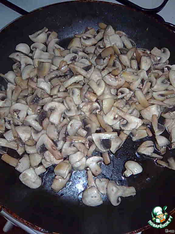 5. В это время шампиньоны чистим, режем на 4 части. Не мельчим. Иначе не будет чувствоваться. А здесь нужно именно ощущать, что вот он гриб))) Выкладываем на разогретую сковородку и ждём, пока грибы не отдадут жидкость. Теперь её можно просто слить. Обжаривать грибы не нужно. Нам главное, чтобы ушла вся влага. Солим совсем немного.