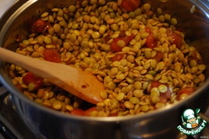 Замоченную ранее чечевицу промыть, воду слить, добавить в кастрюлю с помидорами. Протушить около 3 минут.