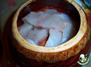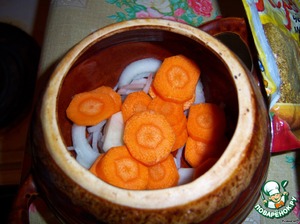 Теперь укладываем все слоями в горшочек:первый слой - лук,затем морковь