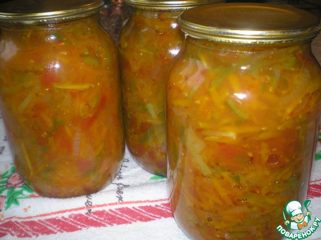 Салат "Прыжок в последний вагон уходящего поезда". Сезон заготовок для многих уже близится к концу. Этим салатом я ставлю жирную точку на всех баночках, крышечках и пр. Рецепт достался от бабули, проверенный, лично готовлю уже лет 5. Салат получается очень вкусный и съедается одним из первых. Не пугайтесь времени приготовления, просто салатик должен постоять 6 часов, поэтому делаю его всегда с утра.
