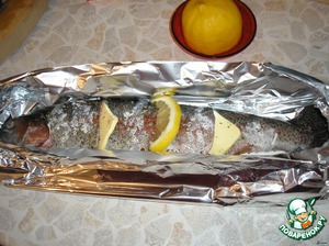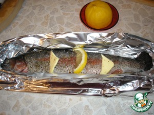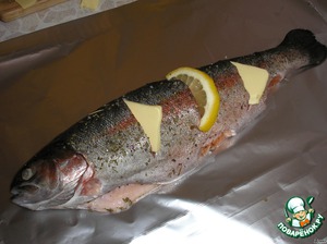 Фольгу сложить в два слоя. Положить рыбу на фольгу, сделать несколько поперечных разрезов, в них вложить кусочки лимона и сливочного масла.