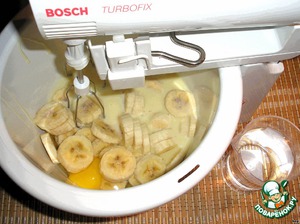Вылить в миску сгущенное молоко, добавить спирт, яйца, молоко и кусочки бананов.