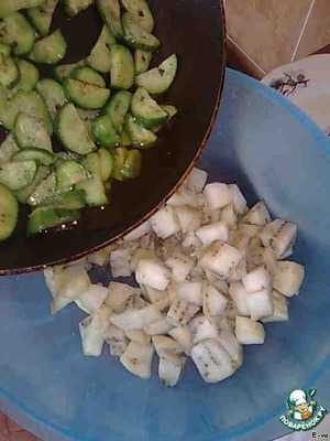 Огурцы не оставляем остывать, а, пока они ещё теплые, смешиваем их с нарезанными баклажанами. (Варим и режем их точно так же, как в первом рецепте: Салат из баклажан «фальшивые грибочки» http://www.povarenok .ru/recipes/show/327 09/. Придерживаюсь того же правила: НЕ ПЕРЕВАРИТЬ!!!) Накрываем крышкой.