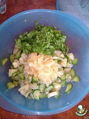 В той же сковороде, где обжаривался огурец, обжариваем тонко нашинкованный лук до готовности и добавляем к баклажанам с огурцами. Туда же добавляем мелко нарубленную кинзу. Выдавливаем пару зубчиков чеснока.