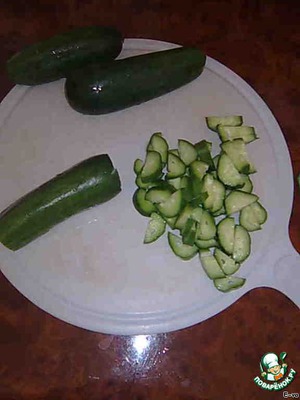 Огурцы разрезаем на 2 половинки, нарезаем не очень тонко.