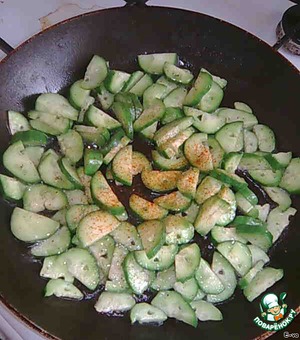 Сковороду хорошо прогреваем, масло тоже должно быть очень хорошо нагрето. Обжариваем сначала несколько долек чеснока (немного раздавить ножом, чтобы лучше отдал аромат), вытаскиваем чеснок, высыпаем на сковороду огурец и обжариваем 3-4 минуты на большом огне, в конце добавляем красный и чёрный перец