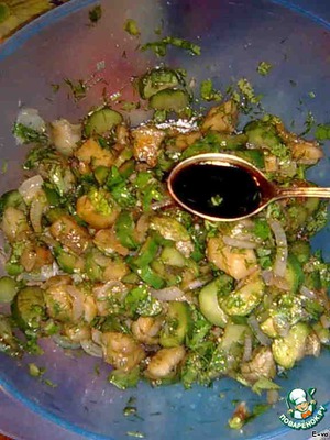 Заправляем салат по вкусу солью, уксусом и жидкой соей.