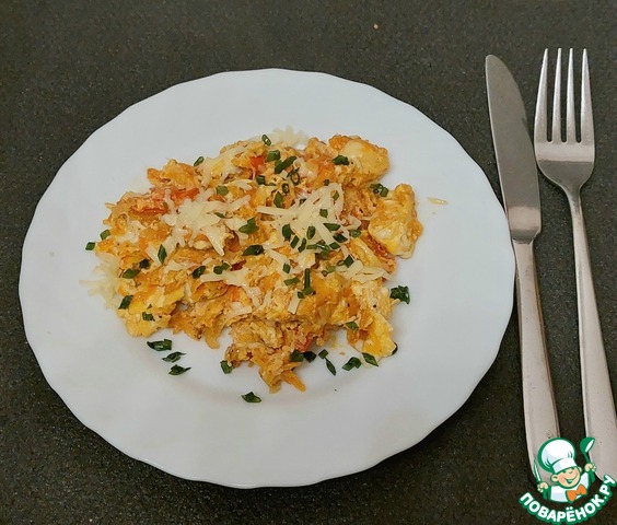 Когда яйца будут готовы, убираем сковороду с огня, засыпаем сыром и укропом, перемешиваем.