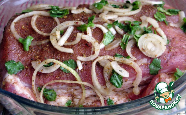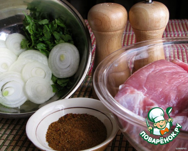 Маринуем мясо в смеси репчатого лука, специй для свинины, соли, перце, кинзе. Оставляем на пару часов.