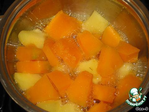 на дно кастрюльки влить чуть-чуть воды, потушить под крышкой тыкву с яблоками до мягкости. -