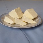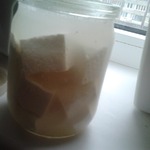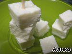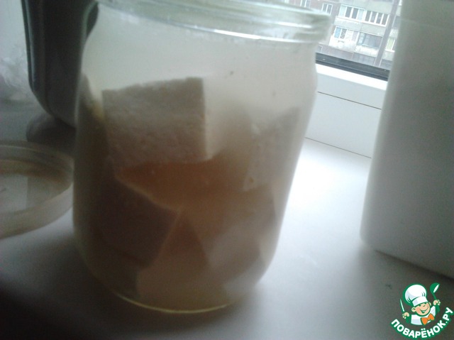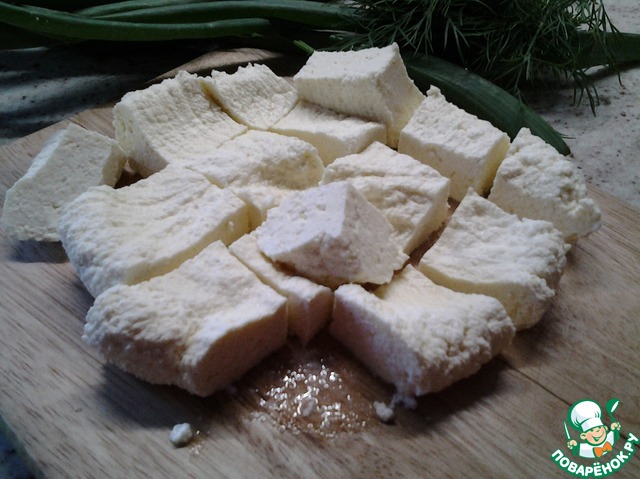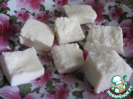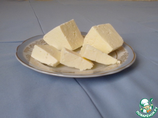 В стакане питьевой холодной воды разводим чайную ложку соли. Выливаем в емкость, где будет храниться Ваш сыр, перекладываем туда кусочки сыра.