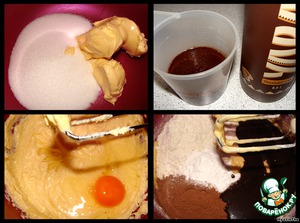 В два захода добавляем муку, а также разрыхлитель, какао-порошок и ликер (у меня был шоколадный, можно кофейный) - все взбиваем на средних оборотах миксера. -