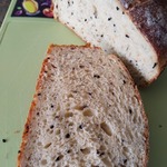 [+5]Вначале колобочек мне показался туговатым, но хорошо, что я в процессе замеса не решилась-таки добавить жидкости, текстура мякиша получилась именно такой, как я люблю, без влажности. Использовала программу "Белый хлеб" на 3 ч. 50 мин., за 10 мин. до окончания смазала верх легкой медово-мучной болтушкой с кунжутом, это приятно для вкуса и хорошо удерживает посыпку, зернышки совершенно не слетают с готового хлеба.