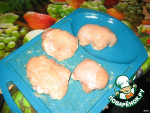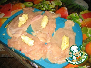 • Грудка без костей, разделить на две части, потом каждую часть горизонтально разрезать. Отбить, в середину положить сливочное масло, смешанное со специями.