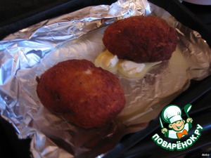 • Затем противень застелить фольгой, туда котлеты, чуть воды, чайная ложка сливочного масла и на 2-3 минуты в духовку (180 градусов). Или можно во фритюре нажарить картошку, сложить в горшок, залить сметаной, а сверху положить котлеты .
