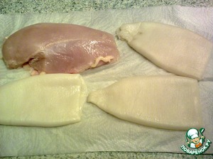 Берем крупное куриное филе и тушки кальмаров (если не чищенные, то почистить). Моем и выкладываем на бумажное полотенце, чтобы обсушить