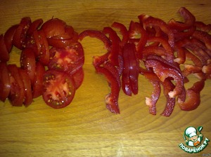 Почищенный сладкий перец нарезать полукольцами. Помидоры нарезать кружочками (если крупные, то еще пополам)
