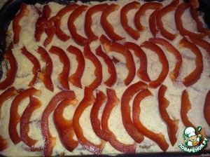 Поверх лука выложить слой помидоров. Посыпать панировочными сухарями (можно и без них) и выложить перец в произвольном порядке