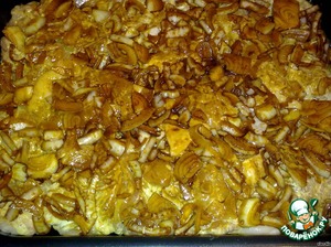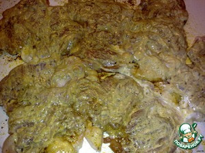 На противень (или форму - все зависит от количества) выложить мясо, затем маринованный лук
