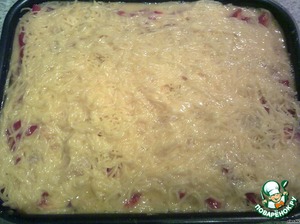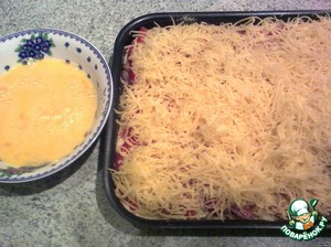 Сверху посыпать тертым сыром. Взбить яйца и залить ими торт.