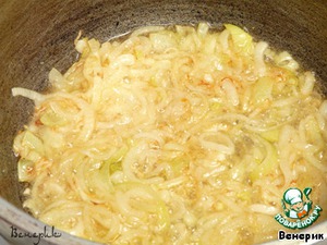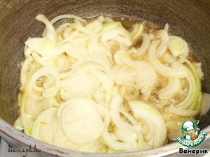 Налить масло в казан, бросить в масло кусочки репчатого лука, перекалить.