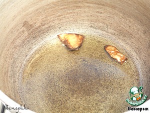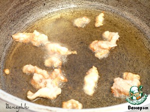 В масло бросить нарезанный внутренний жир, пожарить до состояния шкварок и убрать.
