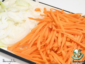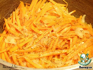 К луку закидываем морковь. Пережариваем, пока морковь не приобретёт золотисто-коричневый цвет.