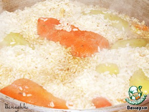 Промытый рис засыпать в казан. Вода должна накрыть рис примерно на 1 см. Зирвак не должен смешиваться с рисом. Прибавить огонь.