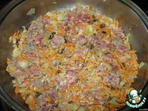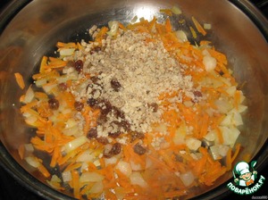 И вместе с промытым изюмом выкладываем к морковке и луку на 2 минутки