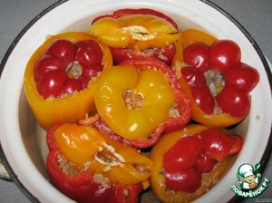Накрываем крышечками - "цветочками" наоборот (на красные перчики кладем желтые крышечки, на желтые-красные крышечки), наливаем в кастрюлю водички, немного ниже перчиков, солим и, закрыв крышкой, тушим 30 минут