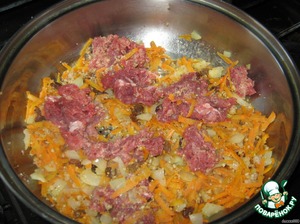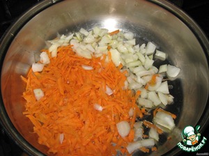 Натертую на крупной терке морковь и мелко нарезанный лук выкладываем на сковородку, слегка обжариваем