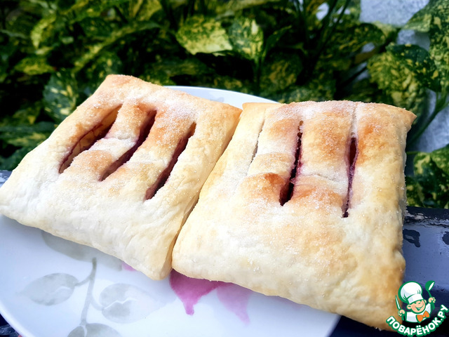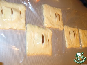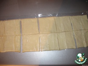 заранее размороженное тесто раскатываем и режем на 12 примерно равных квадратиков (конечно, можете и своим способом)
