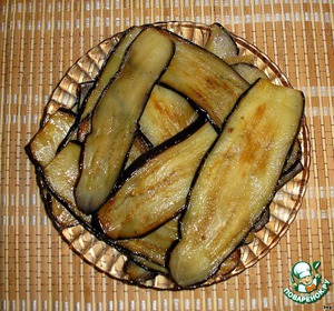 Баклажан нарезать продольными тонкими ломтиками, посолить, поперчить и оставить пропитаться на 10 мин. -