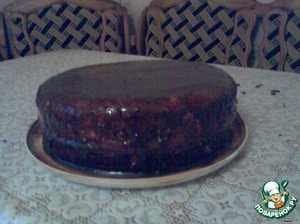 Пока тортик застывает, делаем глазурь: в молоко добавить слив. масло и 0,5 стакана сахара, смешанного с какао-порошком. Варить 15-20 минут. Остудить и обмазать бока и верх торта.
