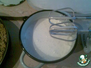 Желатин разогреть, но не кипятить и влить его в белковую массу тонкой струйкой, непрерывно взбивая. -
