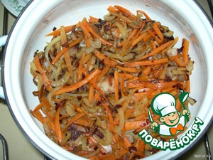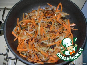 На жире от ребрышек жарим порезанную соломкой морковь и лук полукольцами.