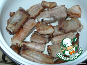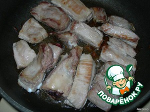 Моем ребрышки и обжариваем их на сковороде с обеих сторон.