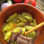 После этого выкладываем овощи в кастрюлю с ребрышками вместе с жидкостью из сковороды.