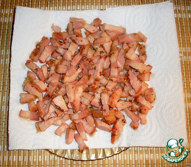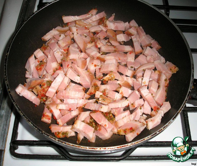 Нарезать бекон кусочками и слегка обжарить. -