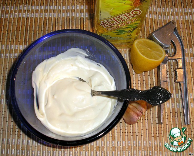 Делаем соус: выливаем в миску майонез, добавляем чайную ложку оливкового масла, сок половины лимона и выдавленный чеснок, перемешиваем до однородной массы.