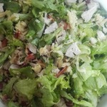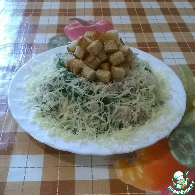 В большую миску рвем листья салата, руками обрываем куриные грудки на маленькие кусочки, добавляем натертый сыр, бекон, высыпаем сухарики и добавляем соус (солить не надо), осторожно перемешиваем и даем немного настояться.