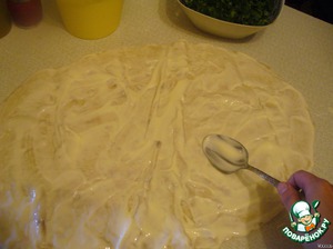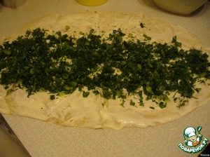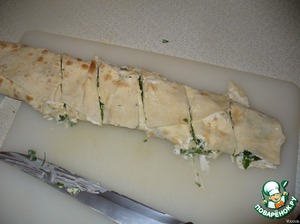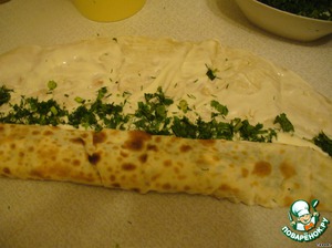 3. Натереть на тeрке треть брынзы, распределяя по длине листа лаваша. Если брынза очень солeная, можно добавить мелко нарезаный помидор.