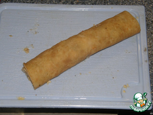Сворачиваем блинчик рулетом, аккуратно, но туго и в холодильник на 10 мин.